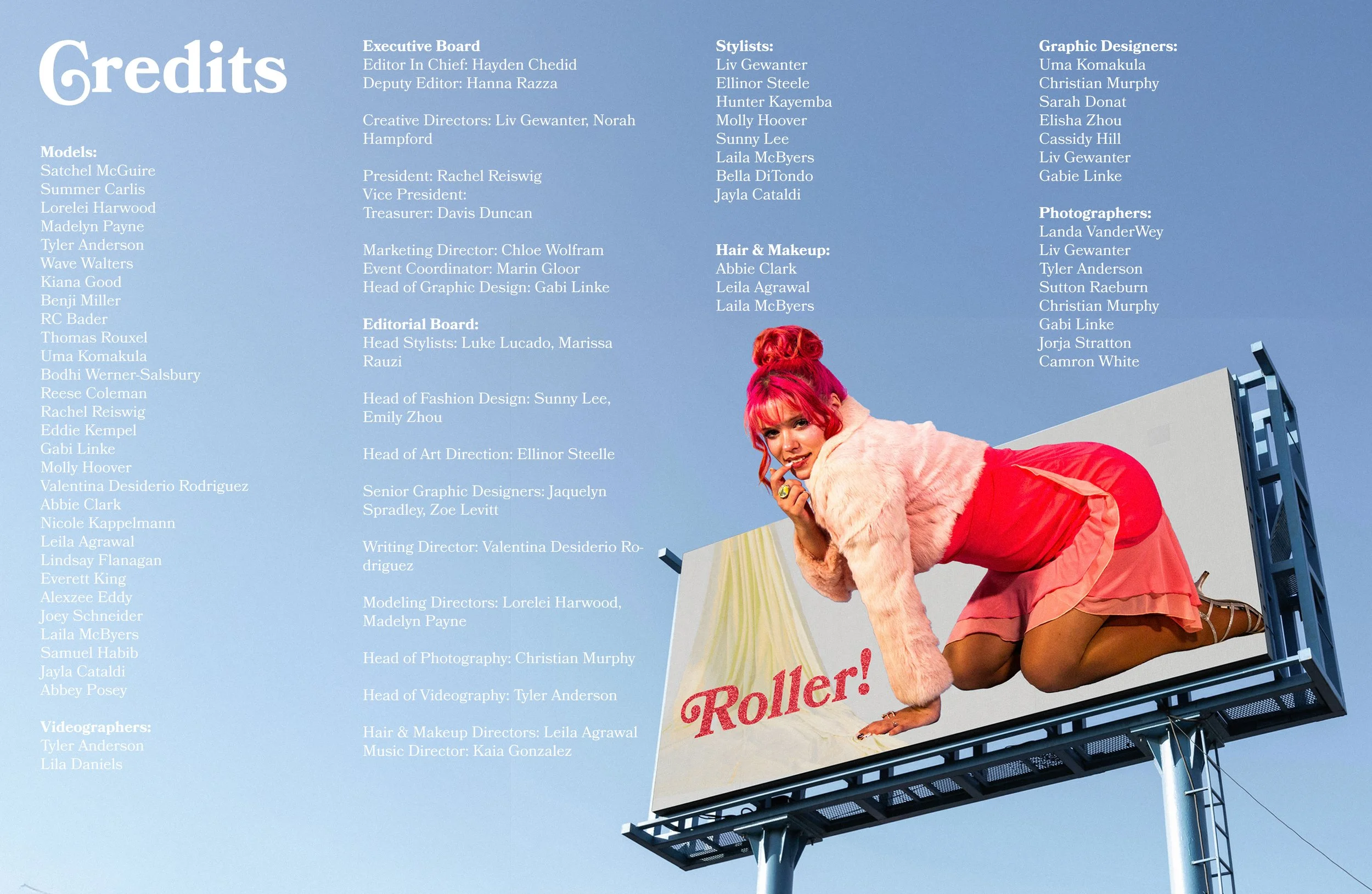 ROAM is the only fashion and lifestyle publication at CU Boulder. I currently serve as senior graphic designer for the magazine, where I create article and photography spreads, logos, and merch (pin design pictured to the right).
